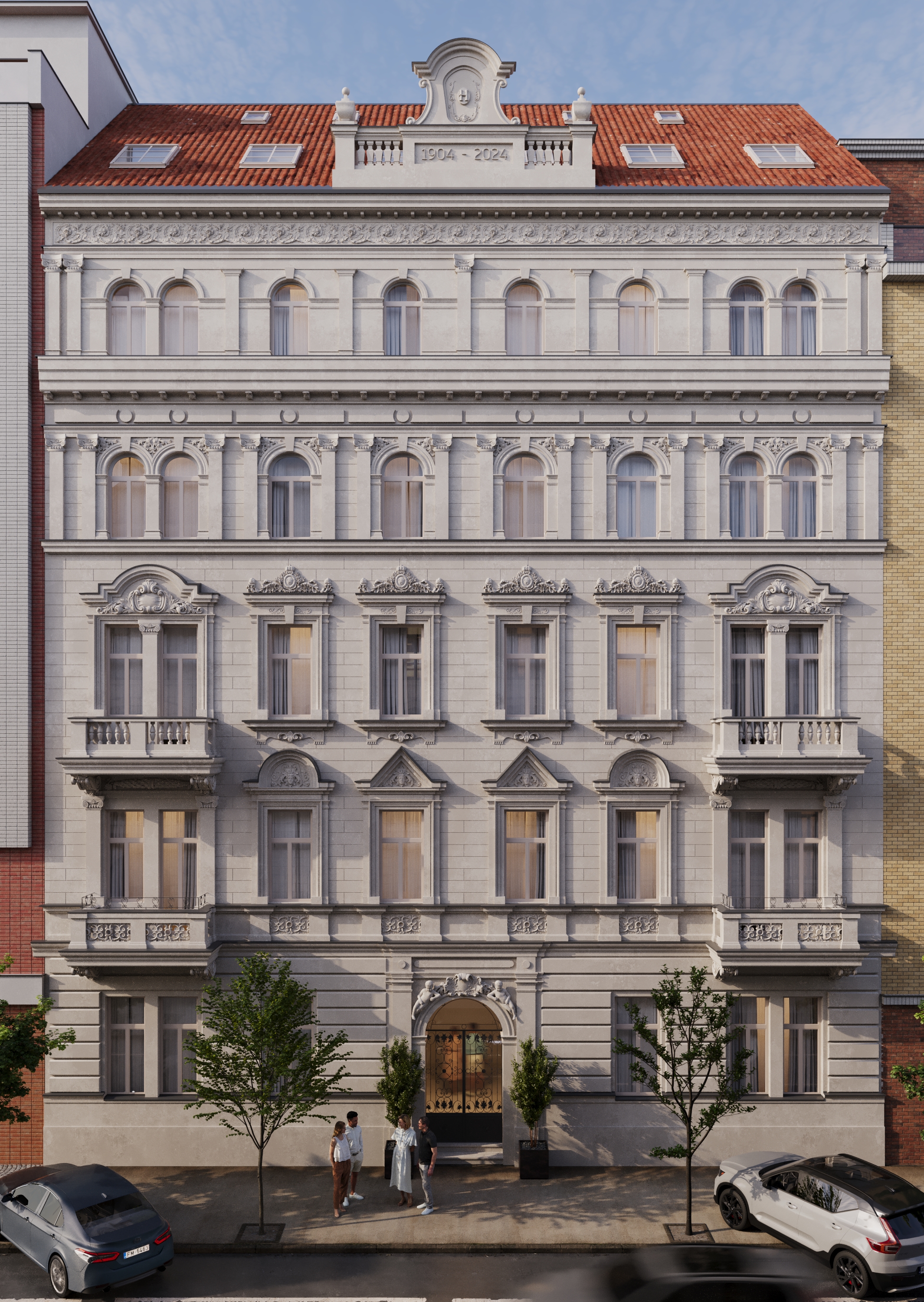 S velkou péčí jsou zadány do výroby historická špaletová okna, dveře, citlivě bude obnovována štuková výzdoba na stropech a stěnách, doplněné mosazné detaily interiérů a masivní dřevěné vstupní dveře do bytů.